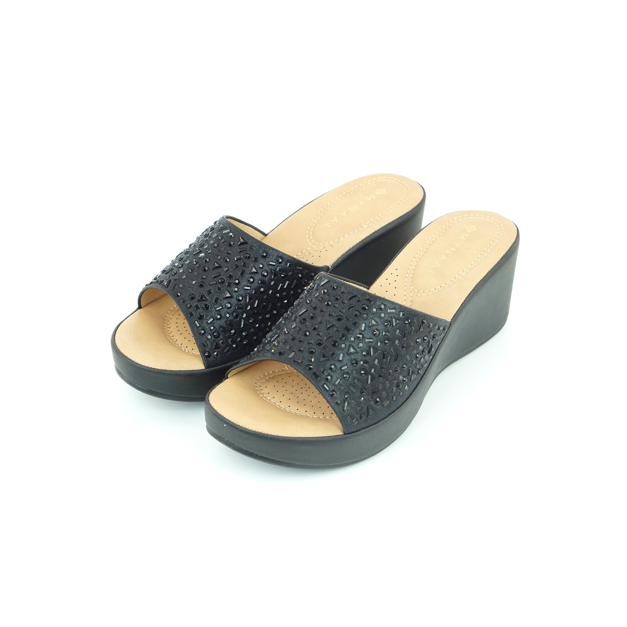 A bold strap crosses the upper, giving the sandal a strong, graphic look. The silhouette sits on a sculpted wedge sole that adds height while keeping the design grounded.
