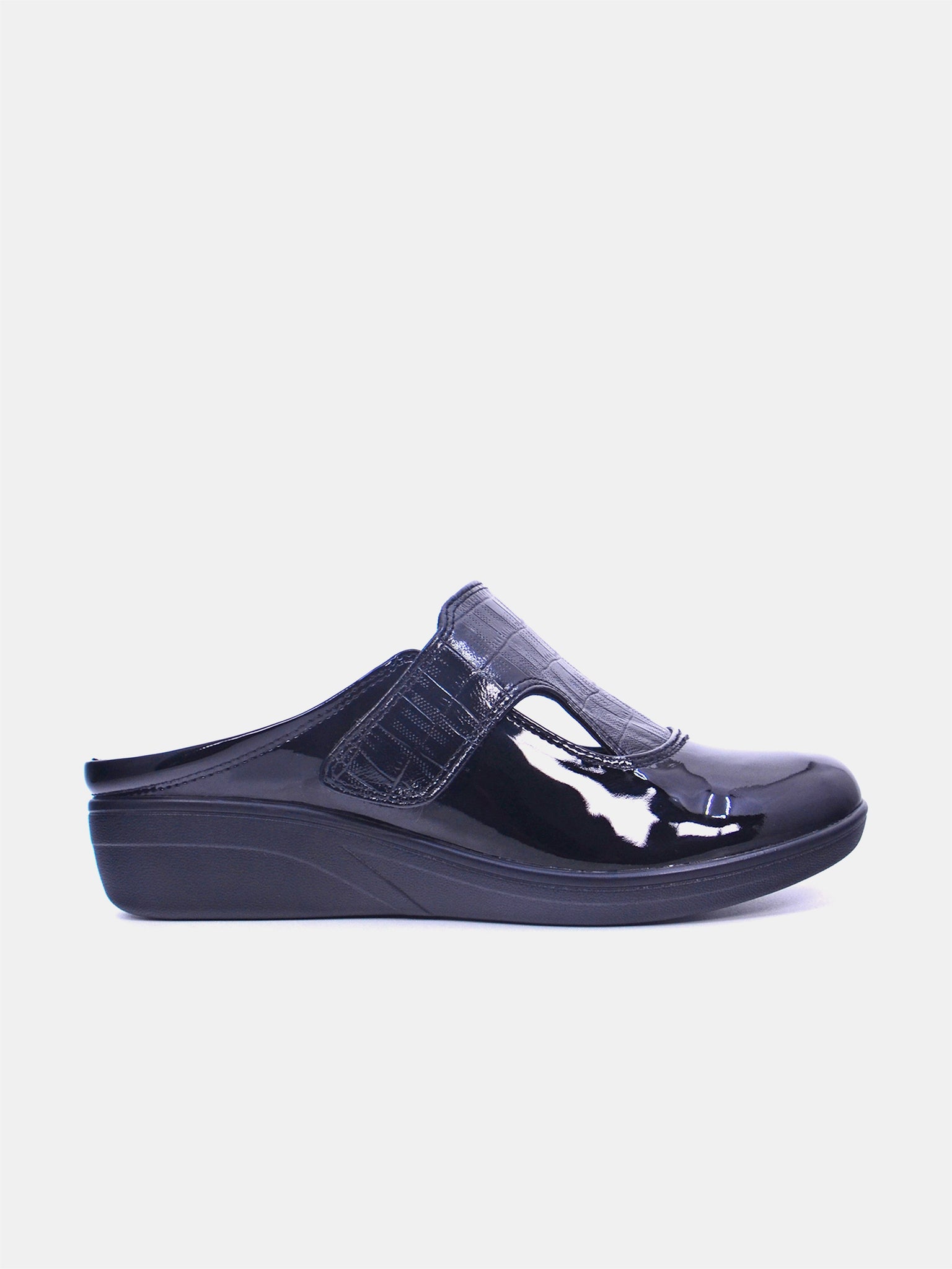 The Perla slip-on mule features a sleek patent finish with embossed detailing for a refined look. A lightweight mule sole provides stability and all-day comfort.