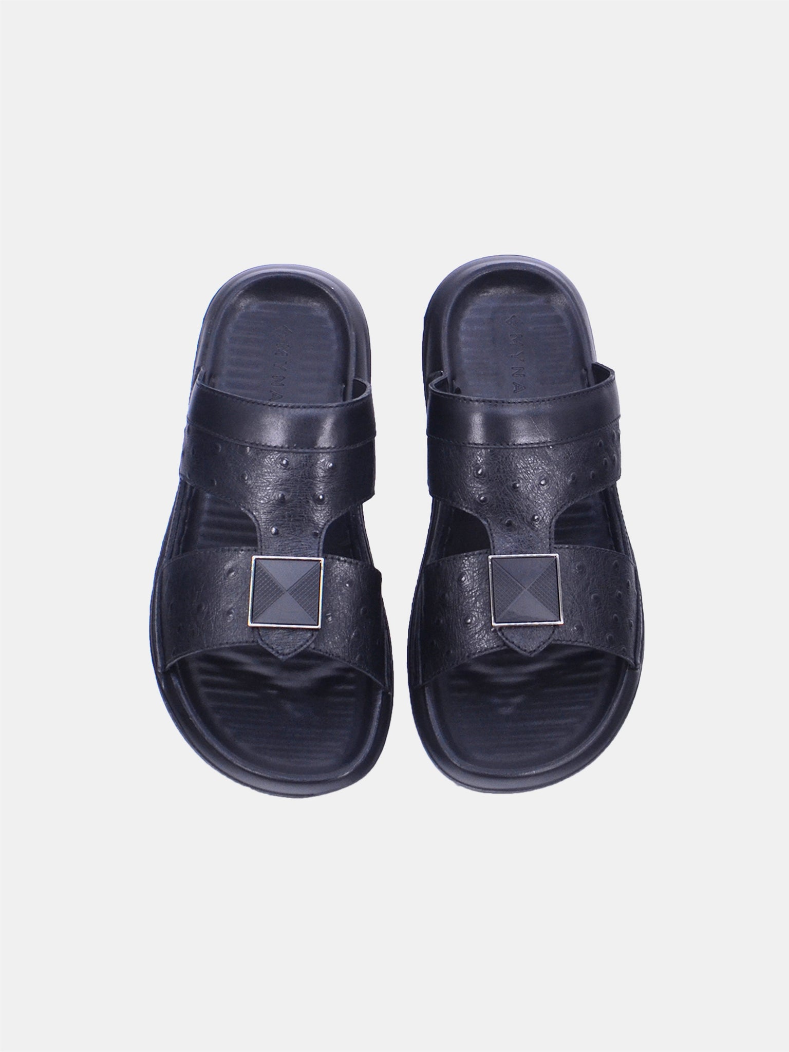 The Jazem sandal showcases a bold dual-strap design with rich textures and a statement buckle accent. A cushioned footbed and slip-on fit ensure effortless style and comfort.