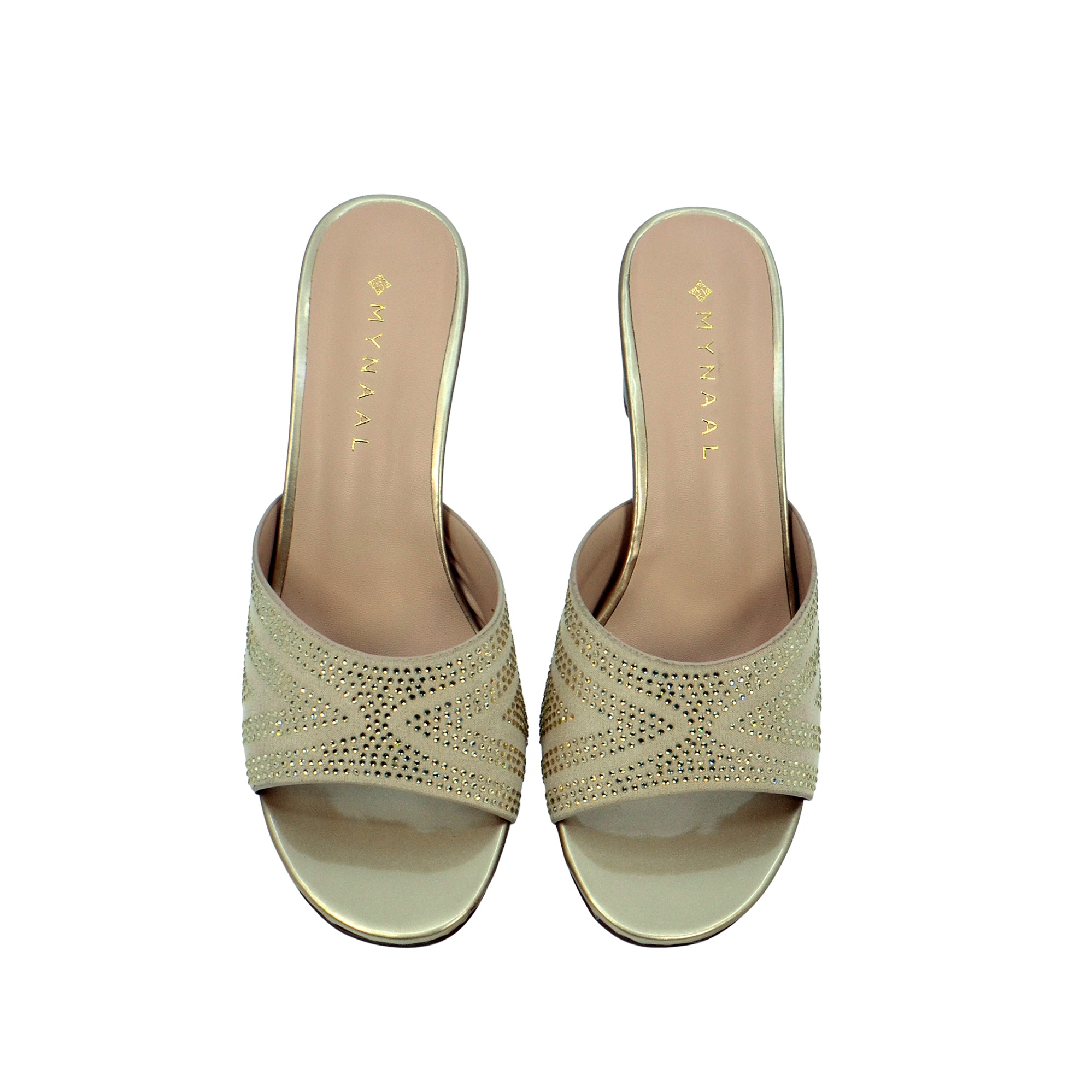 A glamorous heeled sandal with a shimmering embellished strap and metallic block heel. The cushioned footbed offers lasting comfort, making it an ideal choice for evening events and special occasions.