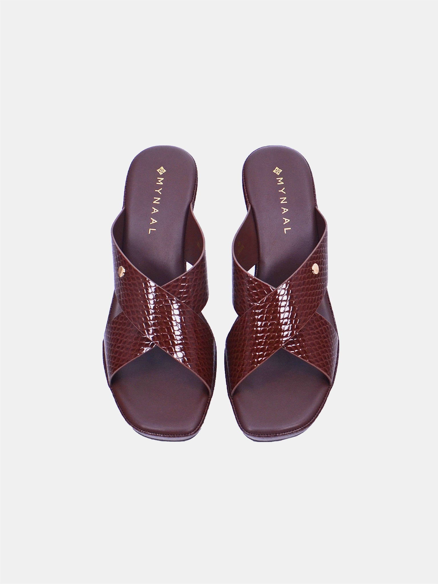 A sophisticated heeled sandal featuring snakeskin-embossed leather with crisscross straps. Designed with a mid-height block heel for comfort and a polished gold-tone detail for an elevated touch.