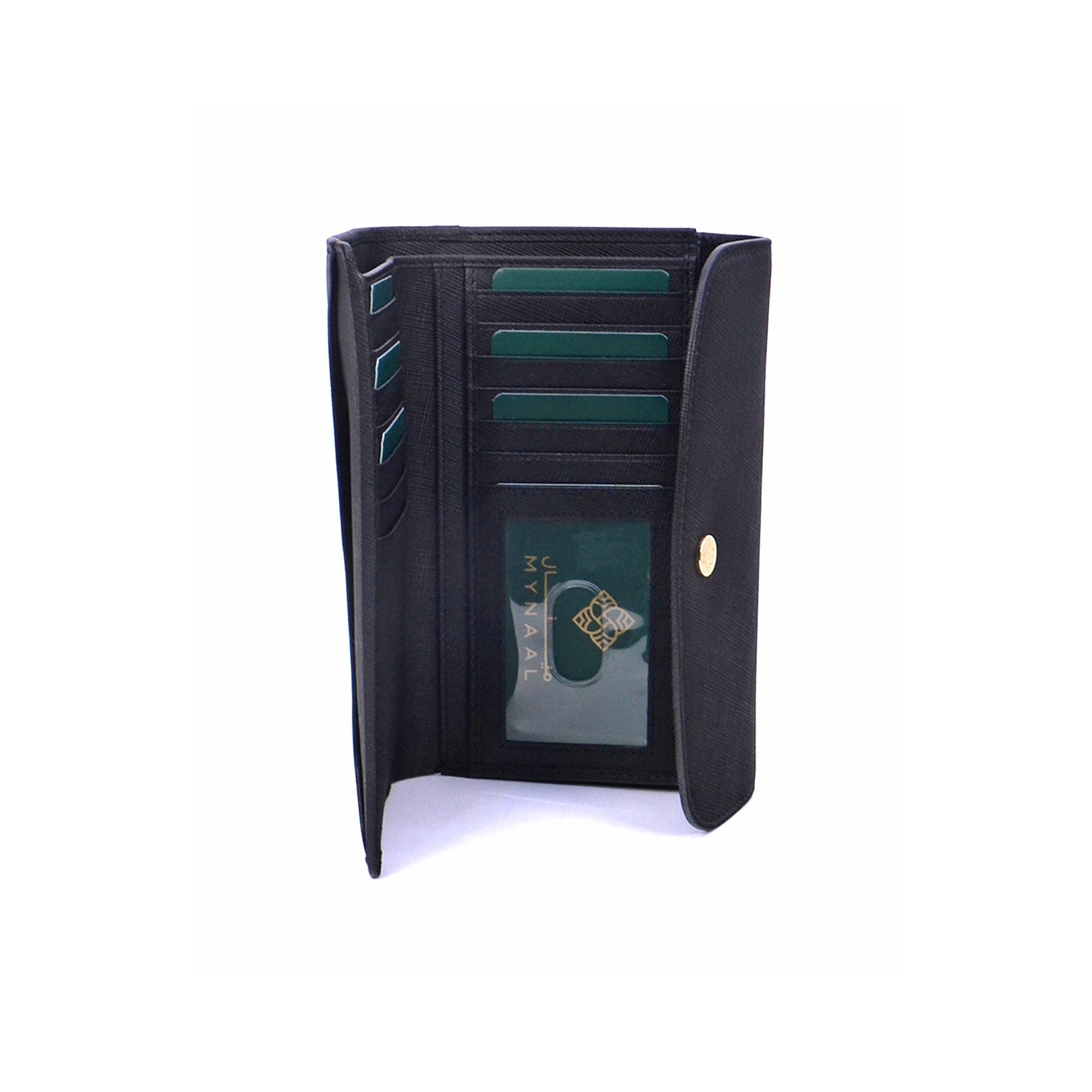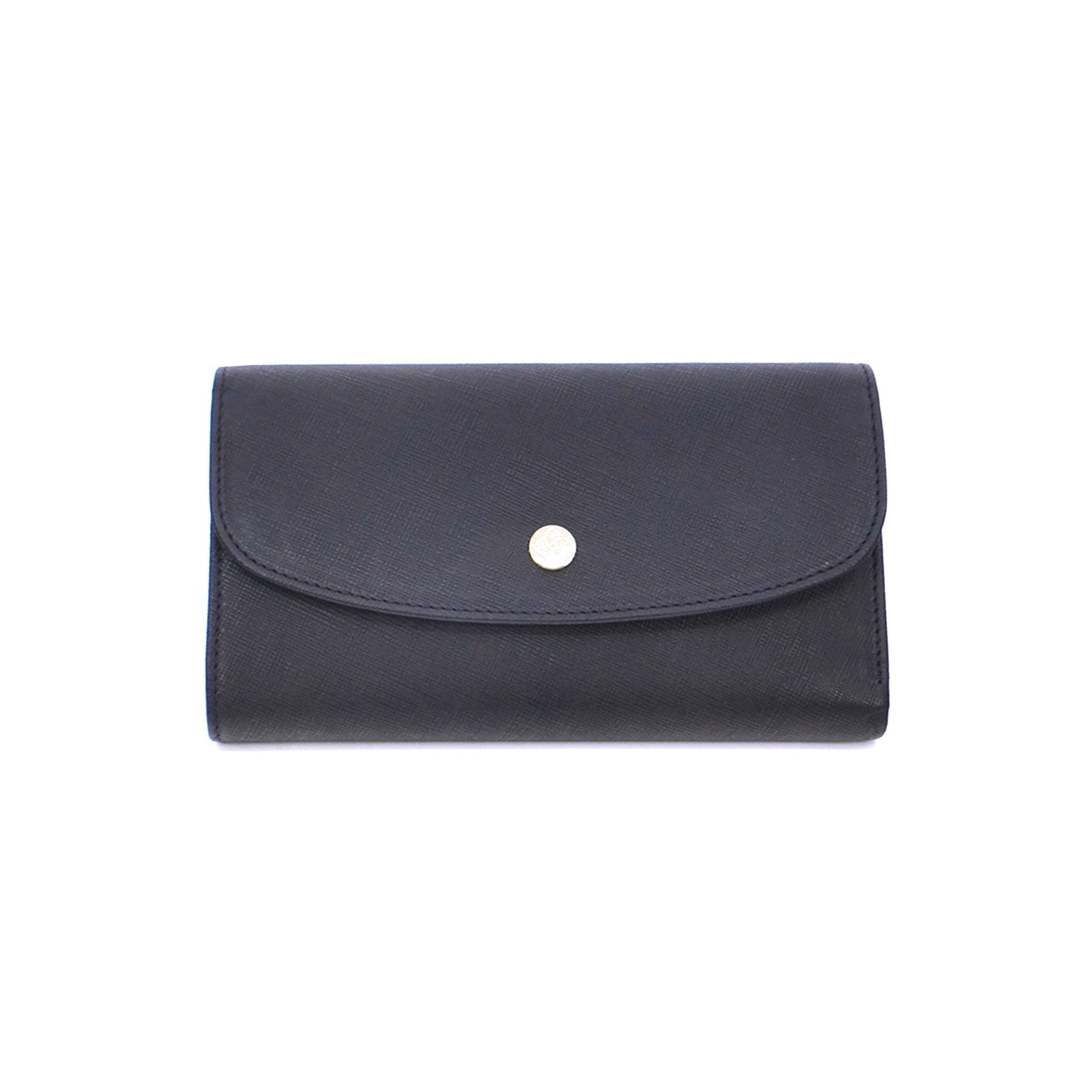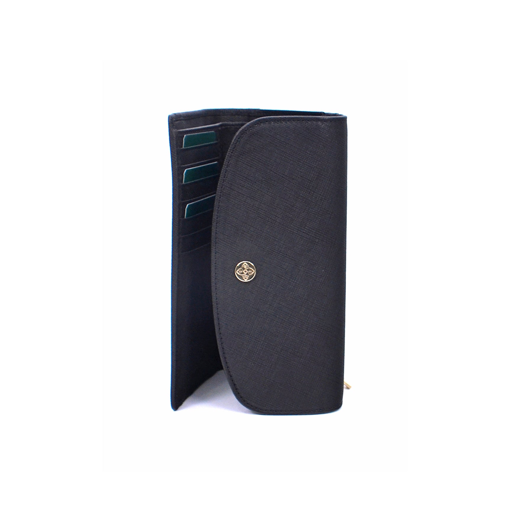 A structured leather wallet detailed with a smooth flap and snap closure. The interior reveals multiple card slots, compartments, and a zip pocket for coins.