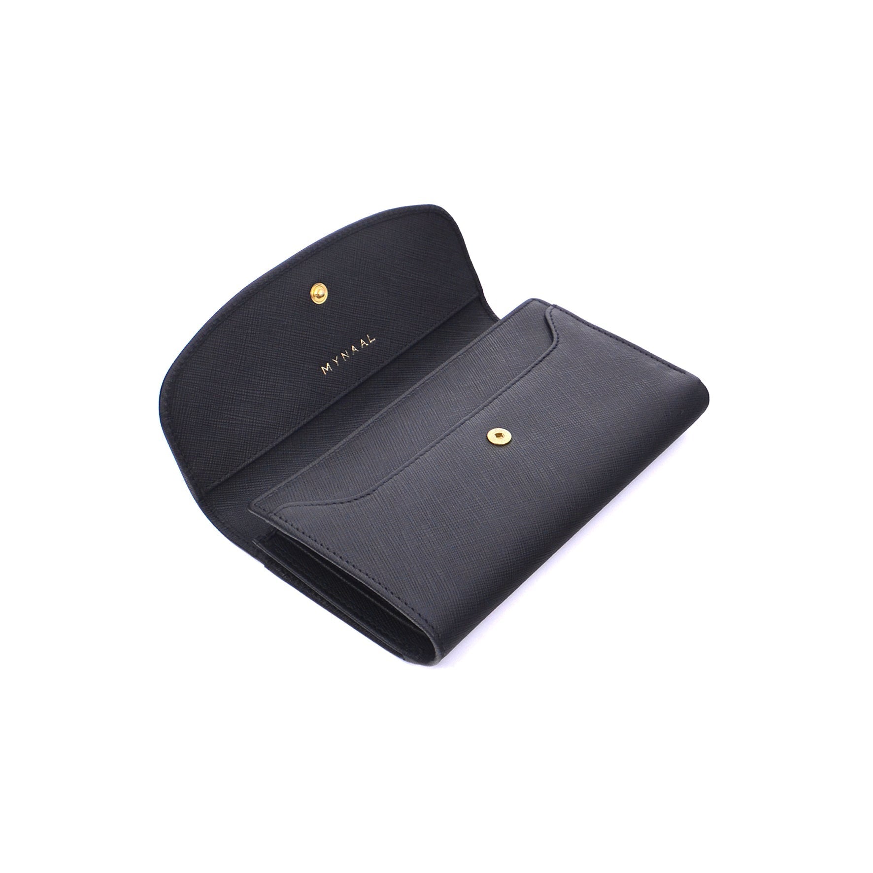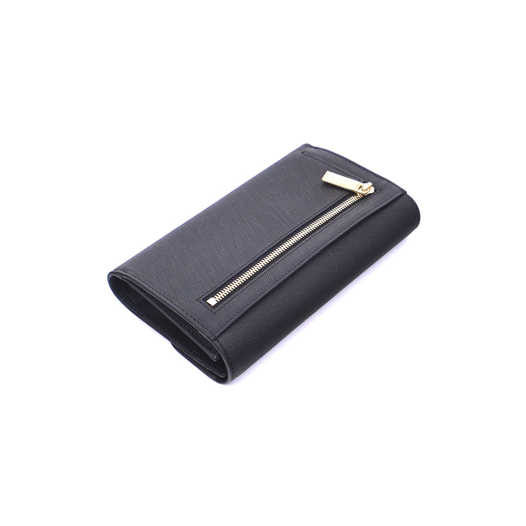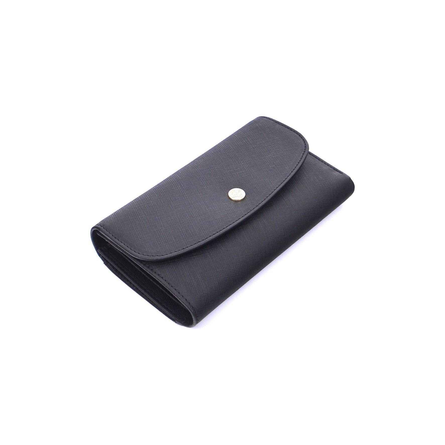A structured leather wallet detailed with a smooth flap and snap closure. The interior reveals multiple card slots, compartments, and a zip pocket for coins.