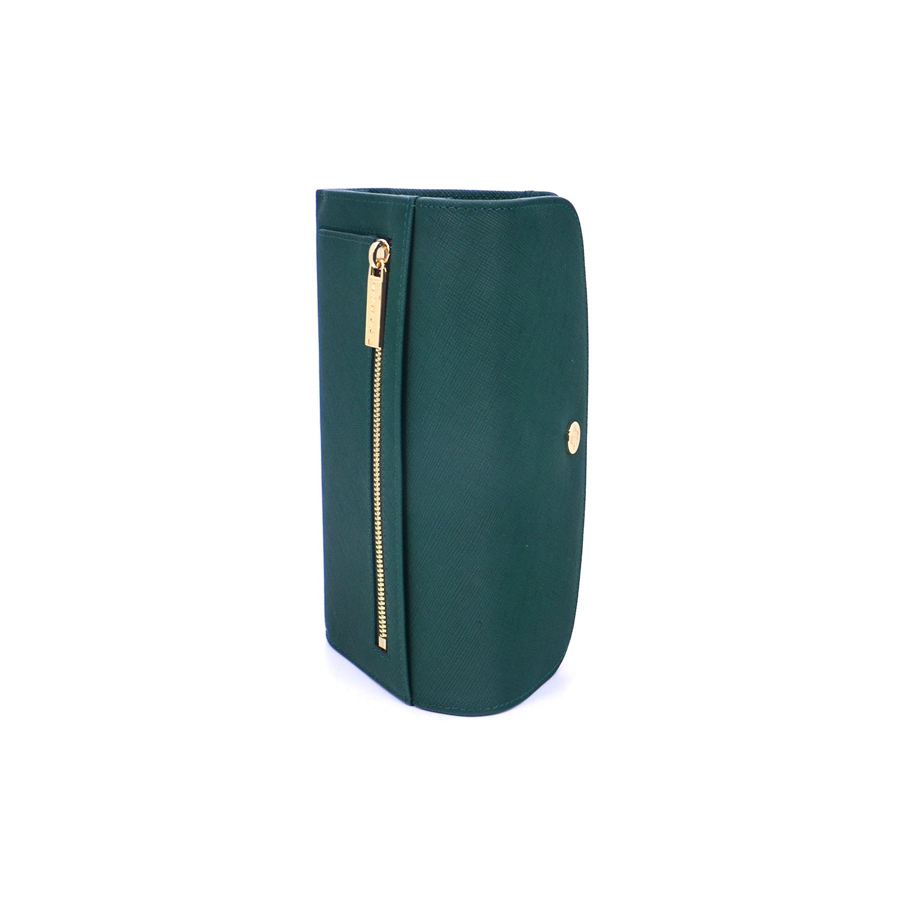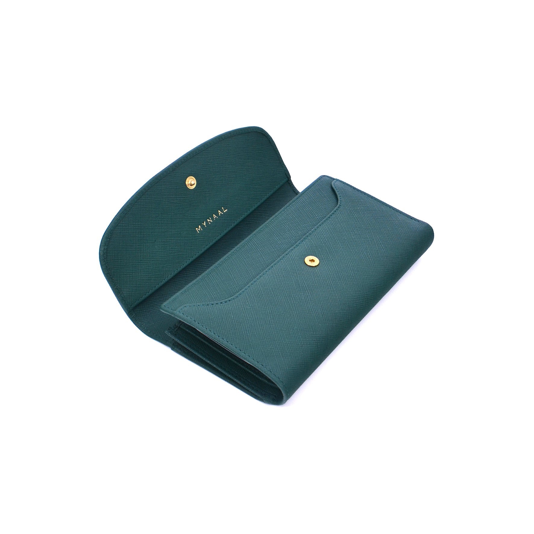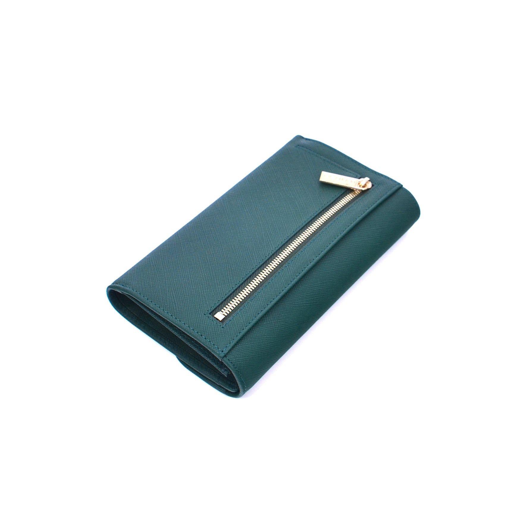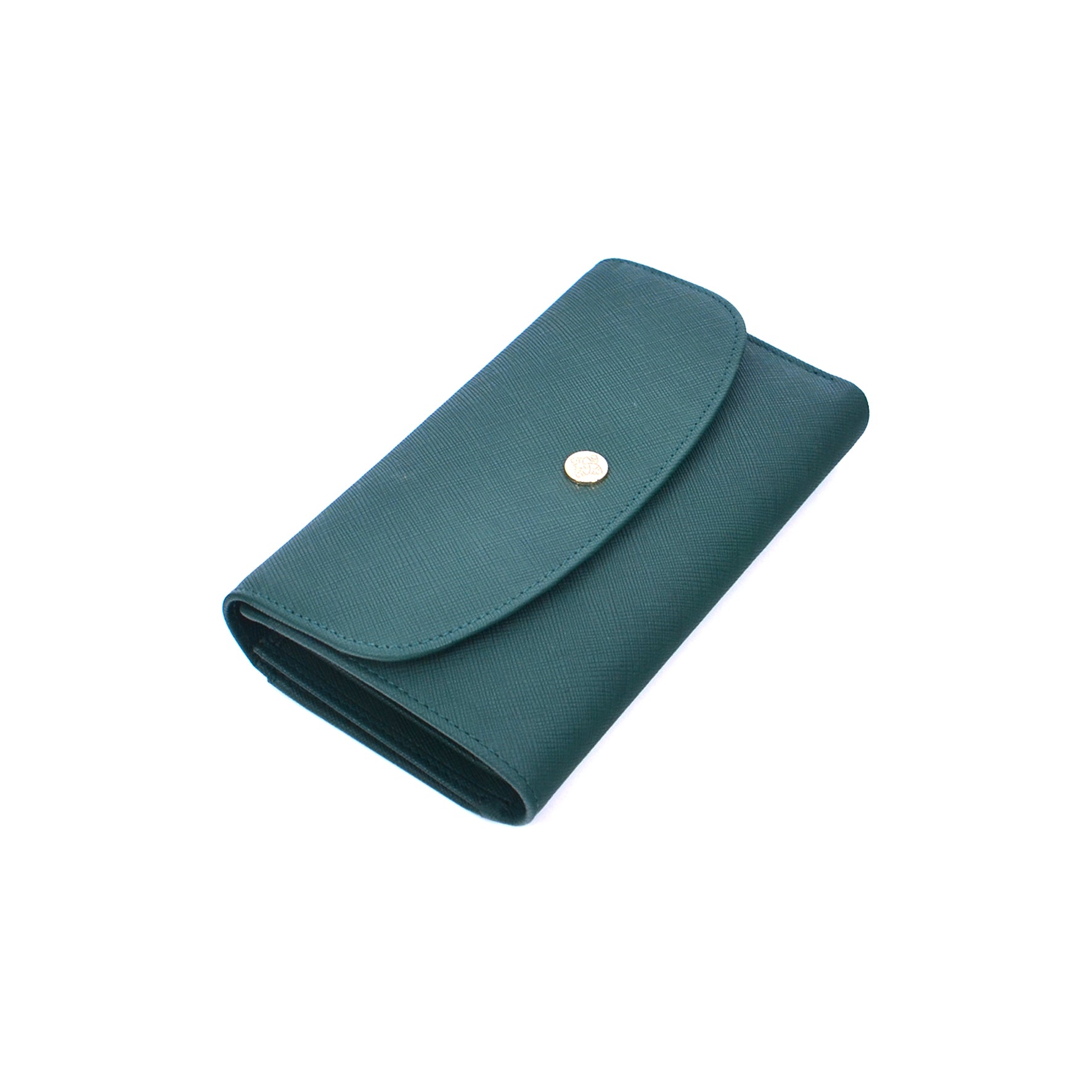 A structured leather wallet detailed with a smooth flap and snap closure. The interior reveals multiple card slots, compartments, and a zip pocket for coins.