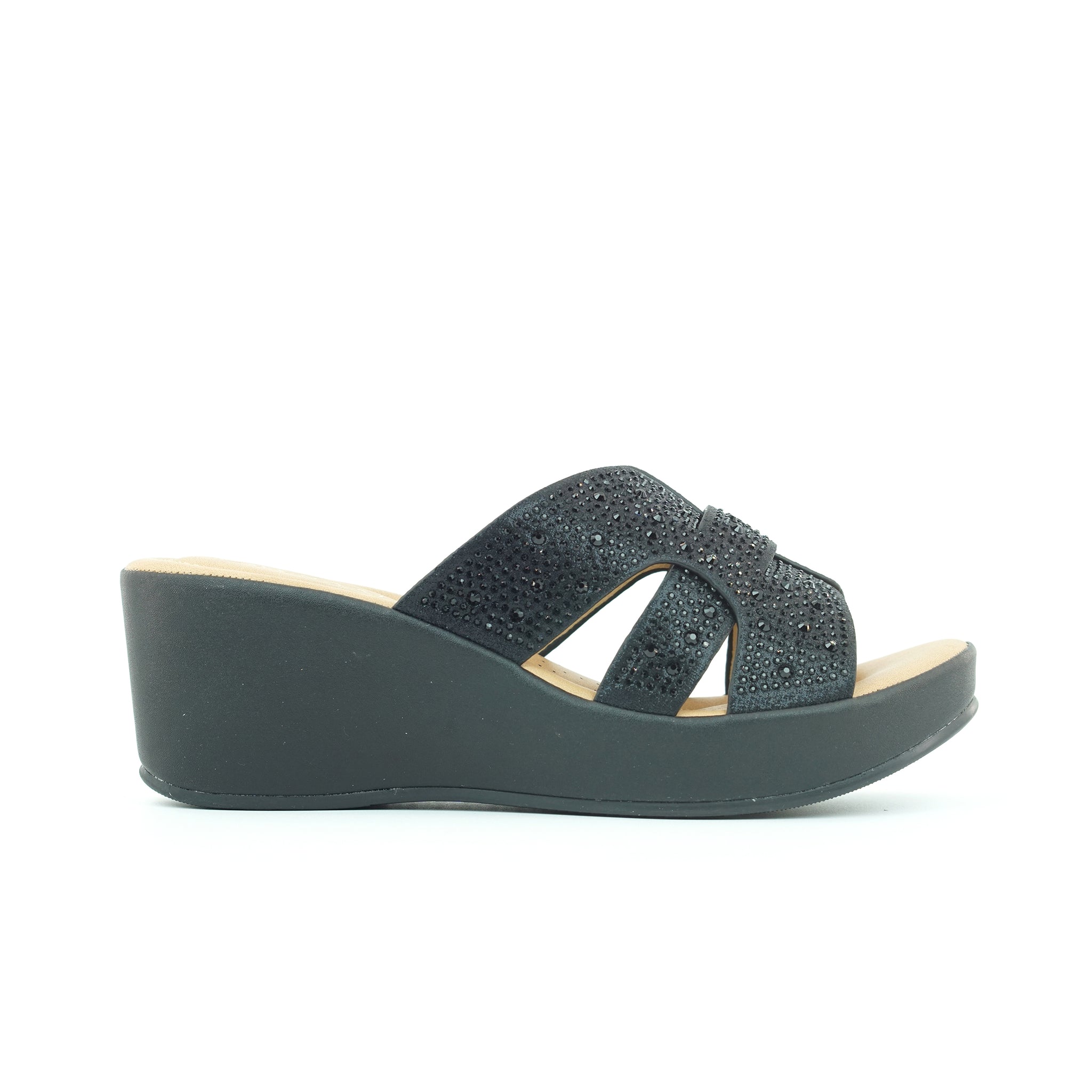 A sculptural wedge shapes the base of this open sandal. Clean straps cross the foot, keeping the silhouette simple and balanced.
